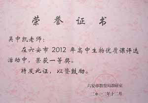 吳中凱,男,2000年7月畢業(yè)于安徽師范大學生命科學學院生物教育專業(yè)。2008年9月獲“縣優(yōu)秀班主任”榮譽稱號;2010年10月被評為中學高級教師;2012年4月所執(zhí)教的錄像課《探究培養(yǎng)液中酵母菌種群數(shù)量的動態(tài)變化》 獲全省中學生物課堂實驗教學優(yōu)秀課例評比二等獎;2012及2015年所指導的學生在省生物學競賽中成績突出;2012年11月在六安市高中生物優(yōu)質課評比中獲六安市一等獎。現(xiàn)為高三年級生物備課組組長。