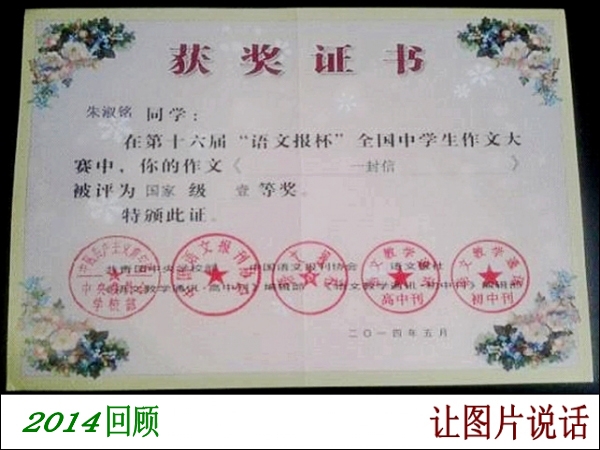 ■9月,第十六屆“語文報(bào)杯”全國(guó)中學(xué)生作文大賽獲獎(jiǎng)結(jié)果揭曉,霍邱一中朱淑銘同學(xué)獲國(guó)家級(jí)一等獎(jiǎng),季良露同學(xué)、黃梟同學(xué)獲國(guó)家級(jí)二等獎(jiǎng)。