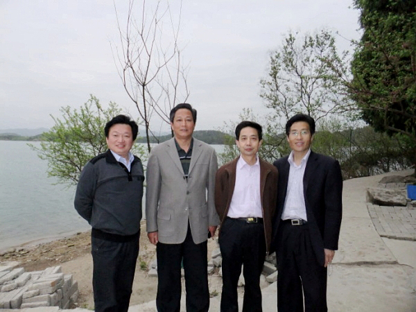 趙克明(左二)與市教科所方忻悟主任,特級(jí)教師陳永睿、何登保合影