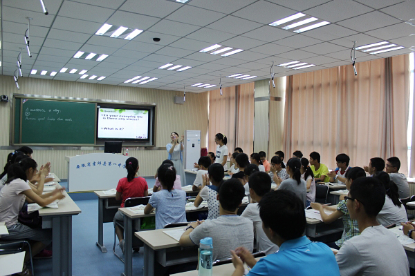 “中外支教”社會(huì)實(shí)踐活動(dòng)辦公室成員周明菊老師執(zhí)教高一科技創(chuàng)新班的一節(jié)英語公開課。興趣是最好的老師,為了培養(yǎng)學(xué)生對(duì)英語的學(xué)習(xí)興趣,周明菊老師首先發(fā)動(dòng)一位喜好舞蹈的同學(xué)伴著樂曲《江南Style》表演騎馬舞,請(qǐng)其他學(xué)生以英語口頭介紹觀感,然后通過有趣的英語游戲來糾正學(xué)生的發(fā)音問題,展開句型訓(xùn)練,對(duì)單詞與課文知識(shí)點(diǎn)加以必要的拓展和補(bǔ)充;她注重以多種多樣的方式充分調(diào)動(dòng)同學(xué)們的課堂參與積極性,組織學(xué)生合作學(xué)習(xí),提升自主學(xué)習(xí)能力,給更多的學(xué)生開口訓(xùn)練的機(jī)會(huì)。整個(gè)教學(xué)過程目標(biāo)明確,方法多樣,環(huán)節(jié)緊湊,調(diào)動(dòng)了同學(xué)們的積極性;教師發(fā)音清晰流利,語速適中,用詞簡(jiǎn)練準(zhǔn)確,展示了高超的英語口語會(huì)話技能,教態(tài)落落大方,幽默的授課方式營(yíng)造了輕松活躍的課堂氛圍,同學(xué)們積極參與她設(shè)計(jì)的情景對(duì)話。上到特別精彩處,筆者注意到,在錄播教室里聽課的高校支教團(tuán)隊(duì)5位成員和霍邱一中老師們笑容滿面。