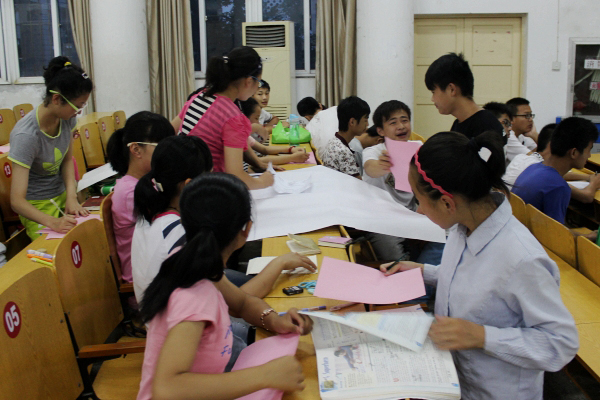 7月15日晚,在霍邱一中報(bào)告廳,中外高校支教團(tuán)隊(duì)指導(dǎo)高一科技創(chuàng)新班學(xué)生設(shè)計(jì)、制作紀(jì)念世界反法西斯戰(zhàn)爭(zhēng)勝利70周年英文海報(bào)。