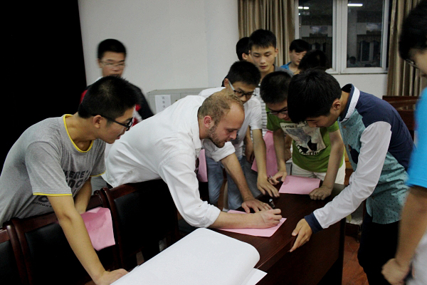 在Guy Balmforth等團(tuán)隊(duì)成員的示范指導(dǎo)下,高一新生分組合作,選取和運(yùn)用海報(bào)設(shè)計(jì)的直接展示主題法、對(duì)比襯托法、突出特征法,手繪海報(bào)。從最初的繪制基本輪廓,再到后來的修改、敷彩,各道工序有條不紊地進(jìn)行。