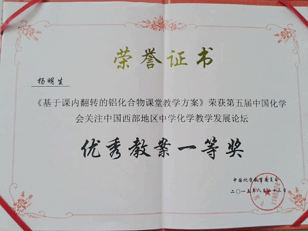 8月23日下午,第五屆中國化學會關注中國西部地區(qū)中學化學教學發(fā)展論壇在山西省運城學院舉行了大會閉幕式及優(yōu)秀論文、優(yōu)秀教案頒獎活動,中國化學會化學教育學科委員會委員、楊明生名師工作室首席名師楊明生撰寫的教案《基于課內(nèi)翻轉(zhuǎn)的鋁化合物課堂教學方案》榮獲優(yōu)秀教案獎(國家級)一等獎。