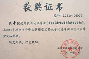吳中凱,男,2000年7月畢業(yè)于安徽師范大學生命科學學院生物教育專業(yè)。2008年9月獲“縣優(yōu)秀班主任”榮譽稱號;2010年10月被評為中學高級教師;2012年4月所執(zhí)教的錄像課《探究培養(yǎng)液中酵母菌種群數(shù)量的動態(tài)變化》 獲全省中學生物課堂實驗教學優(yōu)秀課例評比二等獎;2012及2015年所指導的學生在省生物學競賽中成績突出;2012年11月在六安市高中生物優(yōu)質課評比中獲六安市一等獎。現(xiàn)為高三年級生物備課組組長。