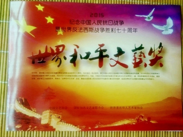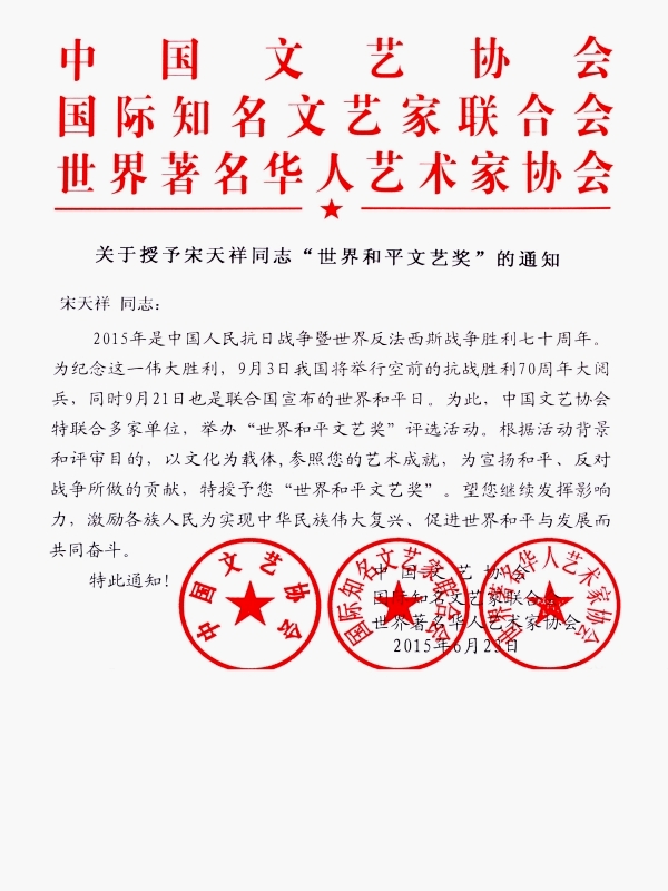 該獎(jiǎng)由中國(guó)文藝協(xié)會(huì)、國(guó)際知名文藝家聯(lián)合會(huì)、世界著名華人文藝家協(xié)會(huì)聯(lián)合頒發(fā)。2015年是中國(guó)人民抗日戰(zhàn)爭(zhēng)暨世界反法西斯戰(zhàn)爭(zhēng)勝利70周年,為紀(jì)念偉大勝利,中國(guó)文藝協(xié)會(huì)特聯(lián)合多家單位,舉辦“世界和平文藝獎(jiǎng)”評(píng)選活動(dòng)。根據(jù)活動(dòng)背景和評(píng)審目的,鑒于宋天祥老師以其藝術(shù)成就為宣揚(yáng)和平、反對(duì)戰(zhàn)爭(zhēng)所做出的卓越貢獻(xiàn),評(píng)選組織單位決定授予他該國(guó)家級(jí)獎(jiǎng)。