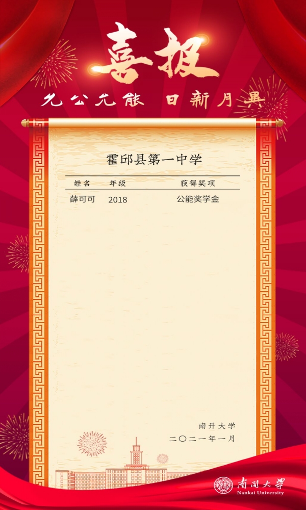 1月20日,霍邱一中收到南開(kāi)大學(xué)寄來(lái)的喜報(bào),獲悉霍邱一中畢業(yè)生薛可可同學(xué)榮獲南開(kāi)大學(xué)“公能”獎(jiǎng)學(xué)金。