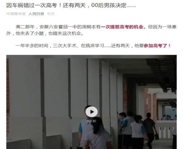 6月5日,《人民日報》微信公眾號以頭條形式報道了霍邱一中周桐同學(xué)的事跡,題為《因車禍錯過一次高考!還有兩天,00后男孩決定……》。