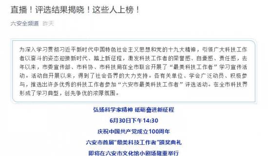 六安市科學(xué)技術(shù)協(xié)會(huì)網(wǎng)站已公示2020年“六安市最美科技工作者” 候選人及提名獎(jiǎng)候選人名單。霍邱一中校長(zhǎng)楊明生入圍。2021年6月30日下午,六安市首屆“最美科技工作者”頒獎(jiǎng)典禮在六安市文化館小劇場(chǎng)舉行。
