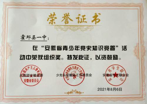 安徽省青少年黨史知識(shí)競(jìng)答活動(dòng)已落下帷幕,霍邱一中獲組織獎(jiǎng)。