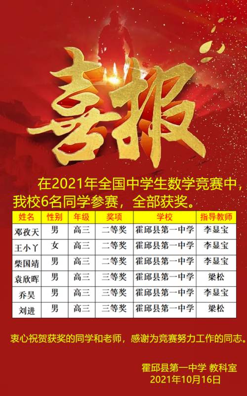 在2021年全國中學(xué)生數(shù)學(xué)競賽中,霍邱一中6名學(xué)生獲獎(jiǎng)。