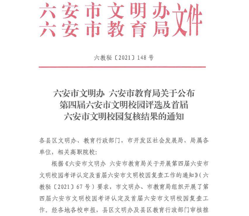 2017年1月,六安市教體局網(wǎng)站公布了首屆“市級文明校園”評選結(jié)果,六安市毛坦廠中學(xué)、六安一中、霍邱一中等35所學(xué)校被認(rèn)定為“六安市首屆文明校園”。