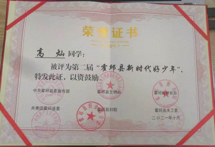 我校高燦同學(xué)獲縣“新時代好少年”榮譽稱號