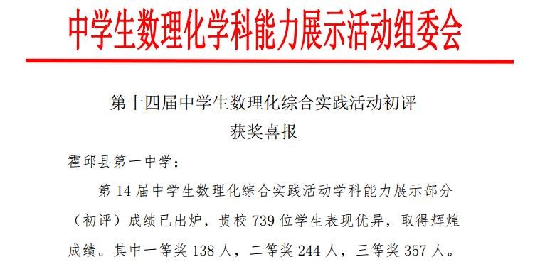 第十四屆全國(guó)中學(xué)生數(shù)理化綜合實(shí)踐活動(dòng)學(xué)科能力展示部分初賽成績(jī)已公布,霍邱一中參賽選手表現(xiàn)優(yōu)異。