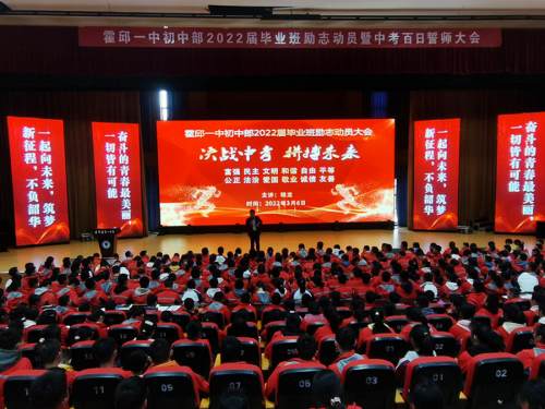 為提振畢業(yè)班學(xué)生迎戰(zhàn)中考的士氣,激發(fā)學(xué)生的拼搏精神,3月6日上午,霍邱一中初中部(霍邱三中)在高中部大禮堂隆重舉行2022屆畢業(yè)班百日誓師勵志動員大會。學(xué)校班子成員、九年級班主任及2022屆畢業(yè)生共兩千余人參加了動員大會,大會由初中部政教處負(fù)責(zé)人主持。學(xué)校特邀全國著名勵志演講家程龍到場為廣大師生加油鼓勁,吹響“決戰(zhàn)中考、拼搏未來”的號角。