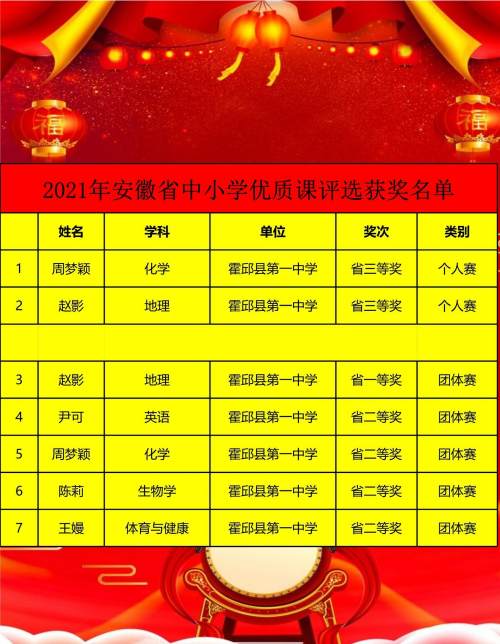 在2021年安徽省中小學(xué)優(yōu)質(zhì)課評(píng)選活動(dòng)中,霍邱一中趙影等7位老師分獲一、二、三等獎(jiǎng)。安徽省中小學(xué)優(yōu)質(zhì)課評(píng)選活動(dòng)由省教育廳組織,分為團(tuán)體賽和個(gè)人賽。