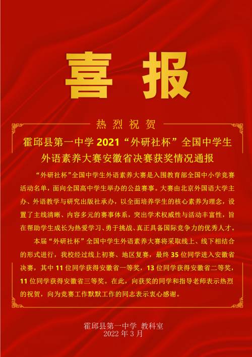2021年“外研社杯”全國(guó)中學(xué)生外語(yǔ)素養(yǎng)大賽安徽省決賽結(jié)果、2021年安徽省中小學(xué)優(yōu)質(zhì)課評(píng)選結(jié)果已公布,霍邱一中多名參賽師生獲獎(jiǎng)。