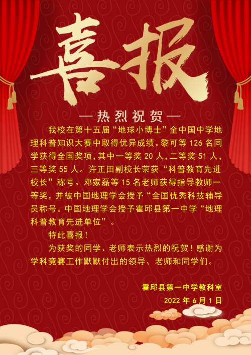 第十五屆“地球小博士”全國地理科普知識大賽比賽結(jié)果已揭曉,霍邱一中20名學(xué)生獲全國一等獎。