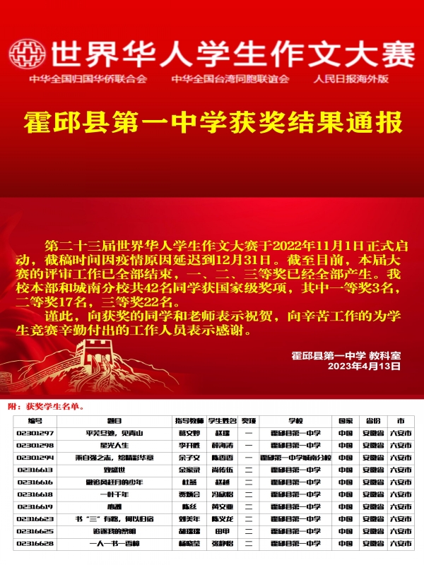 第二十三屆世界華人學(xué)生作文大賽(決賽)已順利落下帷幕。霍邱一中趙瑞等3名參賽學(xué)生獲一等獎(jiǎng)。
