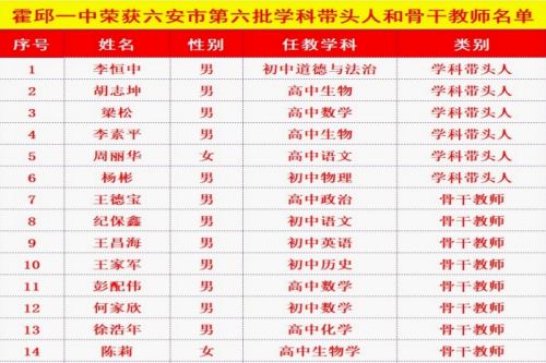 霍邱一中多名教師入圍第六批市中小學(xué)學(xué)科帶頭人、骨干教師名單