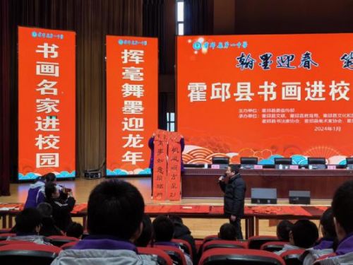 1月27日上午,由霍邱縣委宣傳部主辦,霍邱縣文聯(lián)、霍邱縣教育局、霍邱縣文化和旅游體育局、霍邱縣融媒體中心、霍邱縣書法家協(xié)會、霍邱縣美術(shù)家協(xié)會以及霍邱縣第一中學(xué)共同承辦的“翰墨迎春,筆墨飄香”霍邱縣書畫進校園活動在霍邱一中圖書館報告廳正式啟動。參加本次啟動儀式的有霍邱縣委宣傳部三級調(diào)研員、縣政協(xié)教科衛(wèi)體專委主任潘宗清,霍邱縣文聯(lián)主席王亞,霍邱縣教育工委成員劉春生,霍邱縣文旅體局黨組成員、縣文聯(lián)副主席王菊霞,霍邱縣融媒體中心黨組成員李玉龍,霍邱縣第一中學(xué)黨委書記王德寶,六安市書法家協(xié)會副主席、霍邱縣書協(xié)主席韓凌仕,霍邱縣美術(shù)家協(xié)會主席耿山星,霍邱縣書協(xié)、美協(xié)創(chuàng)作骨干及一中學(xué)生,活動由一中團委書記何仁濤主持。